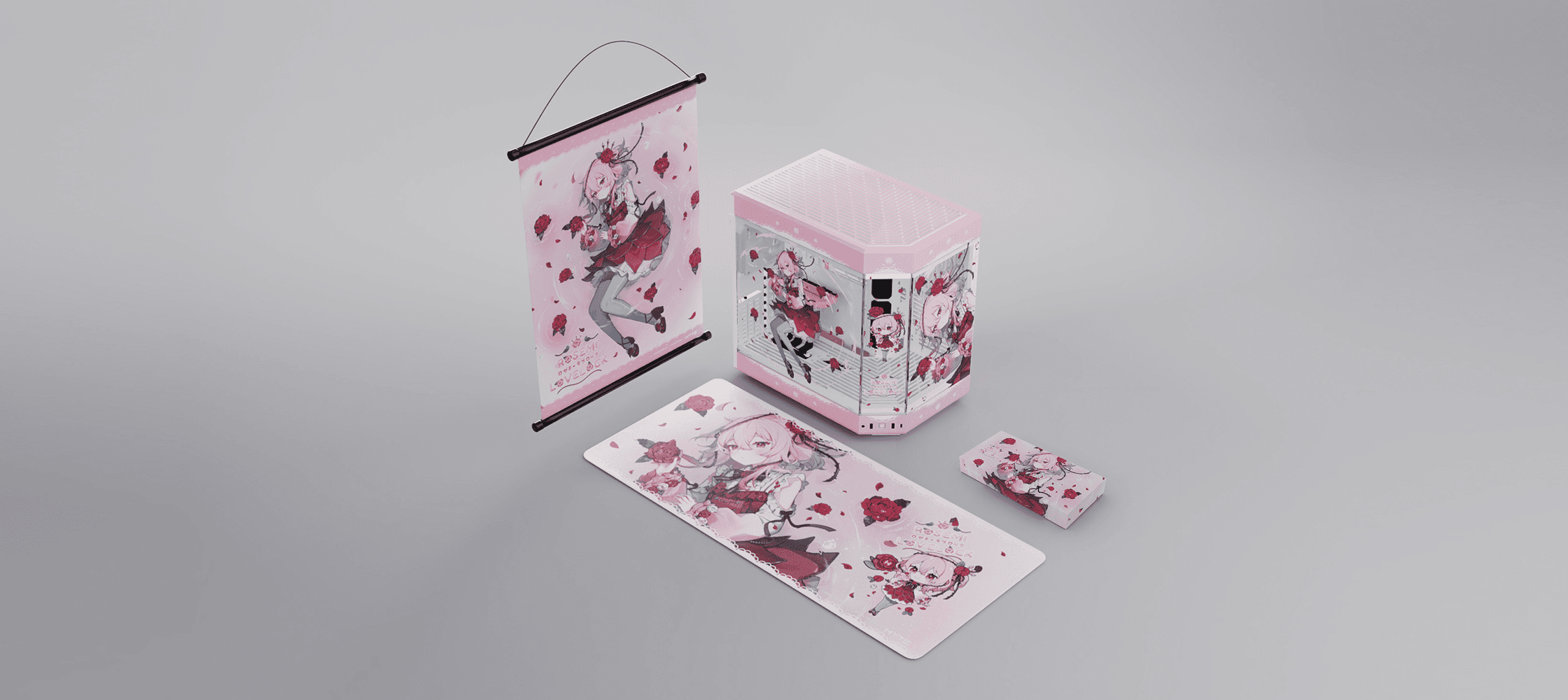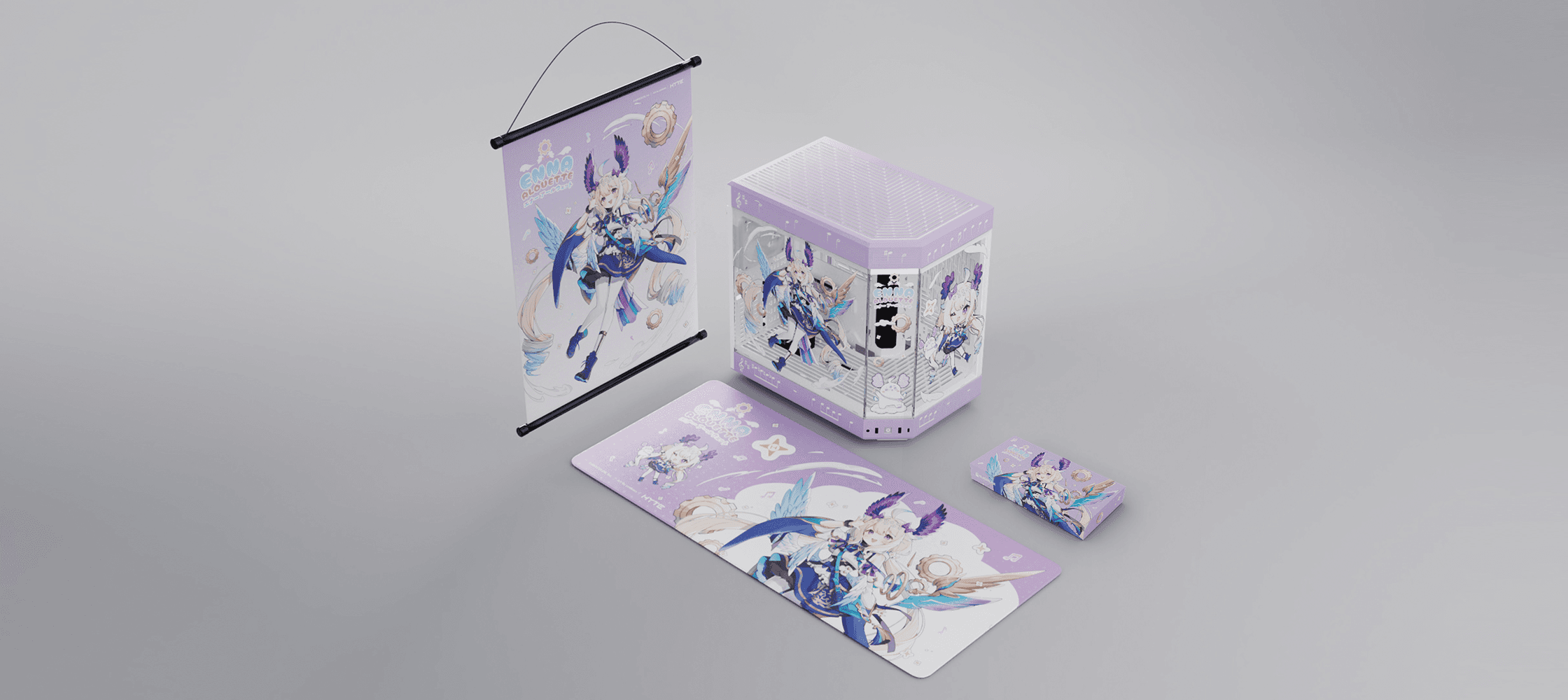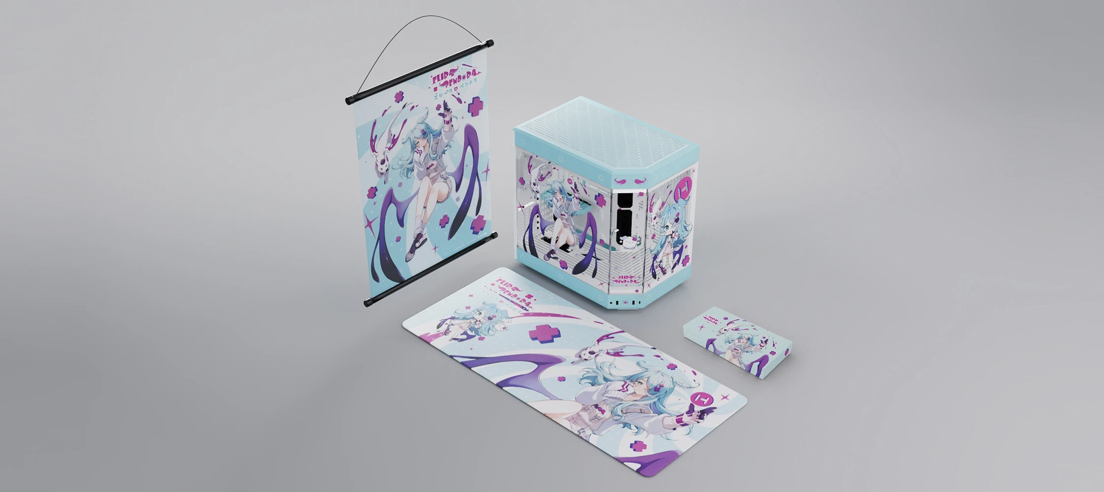 I worked with the three talents to create a cohesive set of thematic peripherals. I designed individual logos and applied them across the line, custom-illustrated keycaps, deskpads, fan shrouds, and a holographic keychain. A pastel palette was chosen to match their characters. Soft, feminine tones that feel on-brand across every SKU.